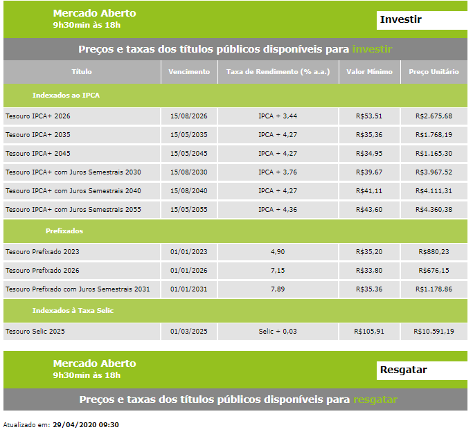 Confira os preços e as taxas dos títulos públicos ofertados nesta quarta-feira (29):