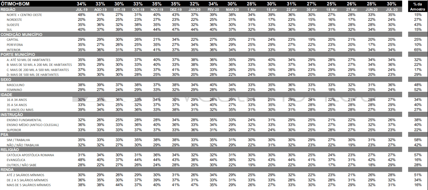 Segundo o levantamento, após atingir a mínima de 25% de avaliações positivas em maio, o mandatário viu o indicador crescer gradativamente até atuais 30%. É a melhor marca desde 24 de abril, quando 31% dos eleitores classificavam o governo como ótimo ou bom, e o mesmo patamar visto em março deste ano ou setembro de 2019. A margem de erro da pesquisa é de 3,2 pontos percentuais.
