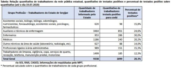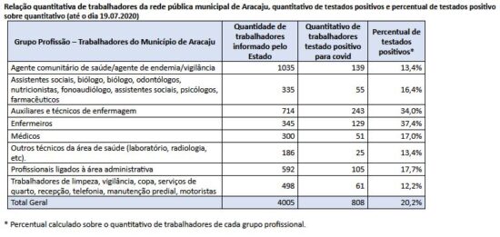 Já em relação ao Município de Aracaju, no mesmo período, o MPT-SE constatou a contaminação de, pelo menos, 808 trabalhadores da rede municipal de saúde, correspondendo a 20,2% do total de 4005 trabalhadores, conforme relação apresentada pelo Secretaria Municipal de Saúde de Aracaju, atingindo diversos grupos profissionais: