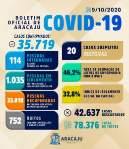 A Secretaria Municipal da Saúde de Aracaju informa que até as 18h desta sexta-feira, 9, foram registrados 96 novos casos de Covid-19 na capital e quatro óbitos.