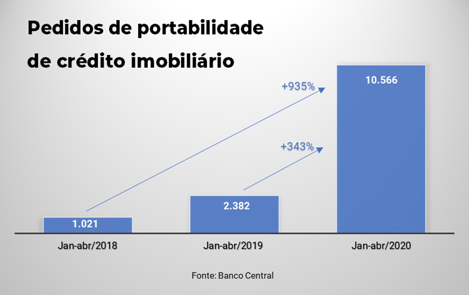 De janeiro a abril de 2020, o país registrou mais de 10 mil pedidos de portabilidade de crédito, mais de quatro vezes o número de pedidos feitos no mesmo período de 2019 (+343%). Na comparação com 2018, o salto é ainda maior, como é possível ver no gráfico abaixo.