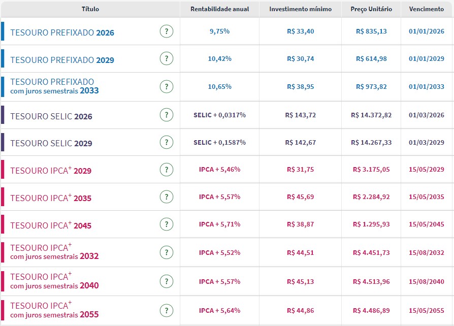 Confira os preços e as taxas dos títulos públicos disponíveis para compra no Tesouro Direto na manhã desta quarta-feira (24):